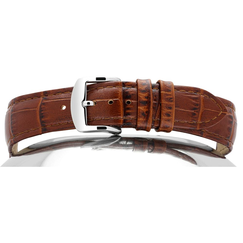 Δέρμα αλιγάτορα, συνθετική φόδρα. Ίδιο χρώμα ραφή. Πόρπη αλουμινίου.